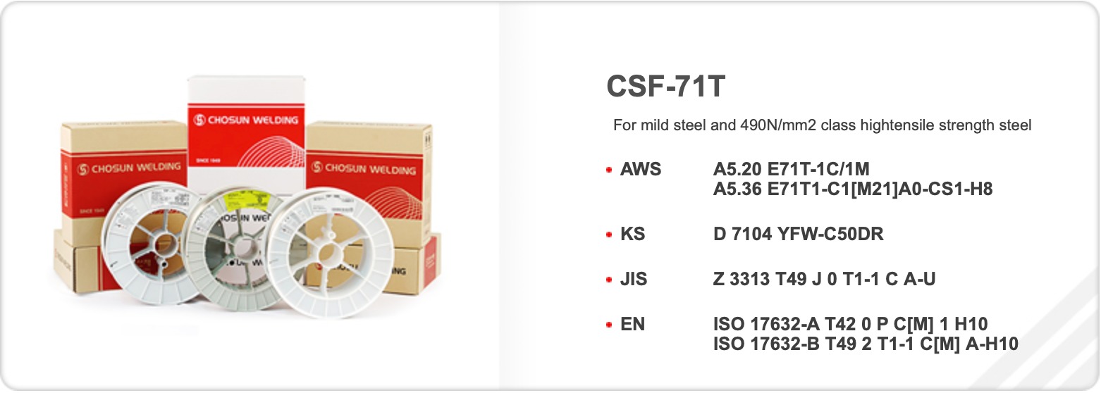 (1) CSF-71T is a titania type flux cored wire and designed for all-position welding by single pass & multi pass with CO2 gas shielding.