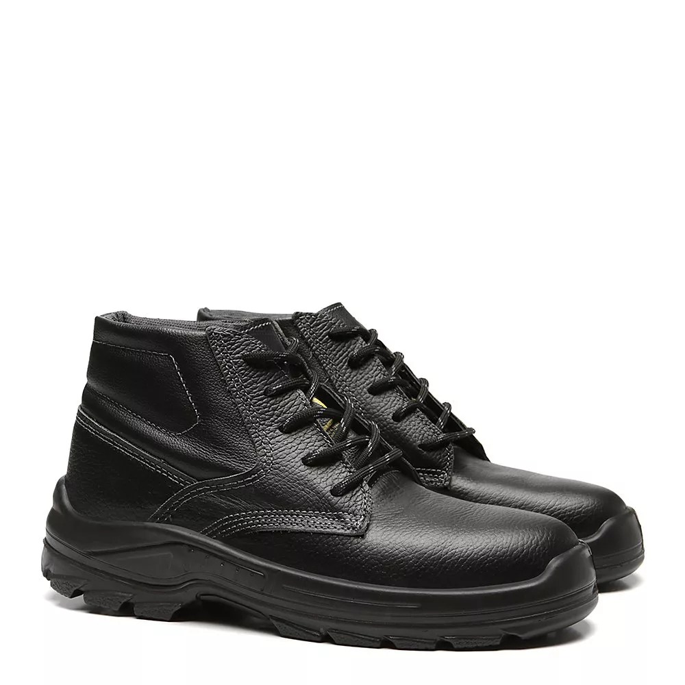Botina ocupacional fechamento em cadarço, cabedal construído em couro estampa relax, com forração interna no colarinho em tecido, dorso forrado em tecido e acolchoado com espuma, forração interna da gáspea em não tecido, biqueira em polipropileno, palmilha de montagem em não tecido costurada pelo sistema strobel e sobre-palmilha de conforto em EVA. Solado em poliuretano (PU) bidensidade, injetado diretamente ao cabedal, resistente a escorregamento (SRC), óleo combustível (FO) e com absorção de impacto na região calcânea (E).
